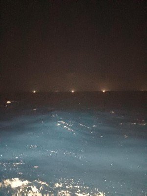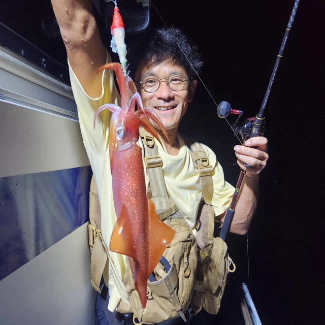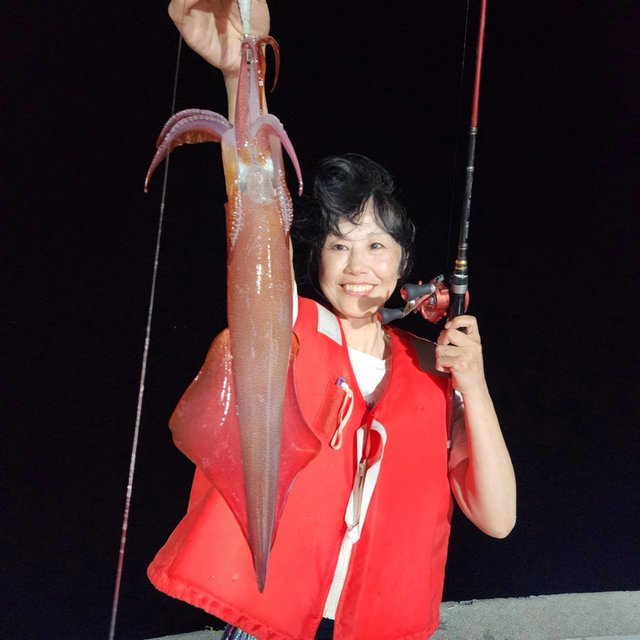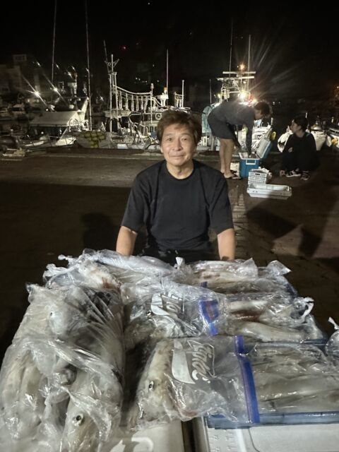(ケンサキイカ)夜焚きイカ釣りに出港。 のち、波風あった、おまけに、月が明る過ぎ 何とか、15ハイから50ハイ位で型も良かった ありがとうございます。