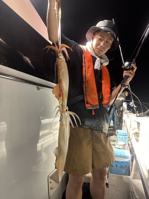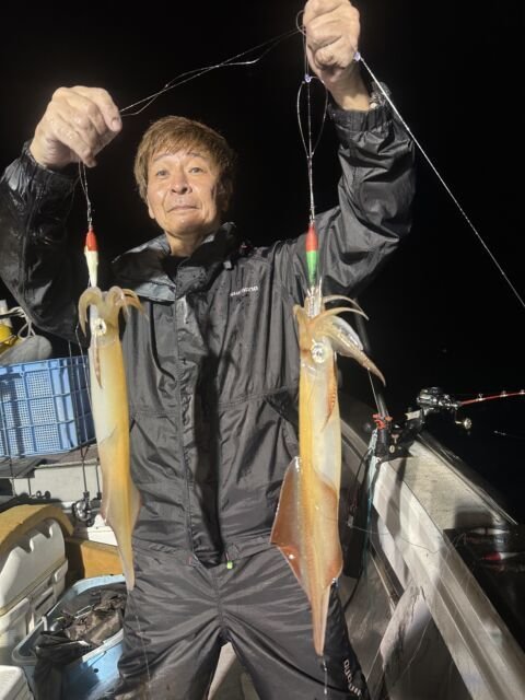 (ケンサキイカ)ヤリイカ 少し風が残ってましたが出てみました。 沖合いは凪。 イカはプチ爆釣。 サイズも良し。 ダブル。トリプル。 クーラー入らず23時店じまい。 まだまだイカ釣れてますよ。