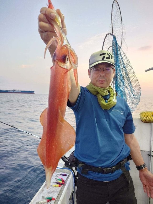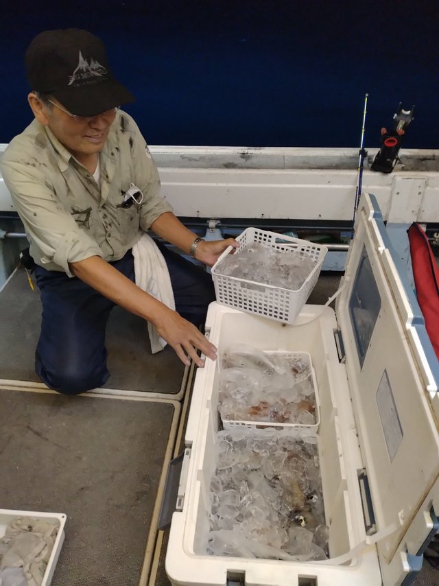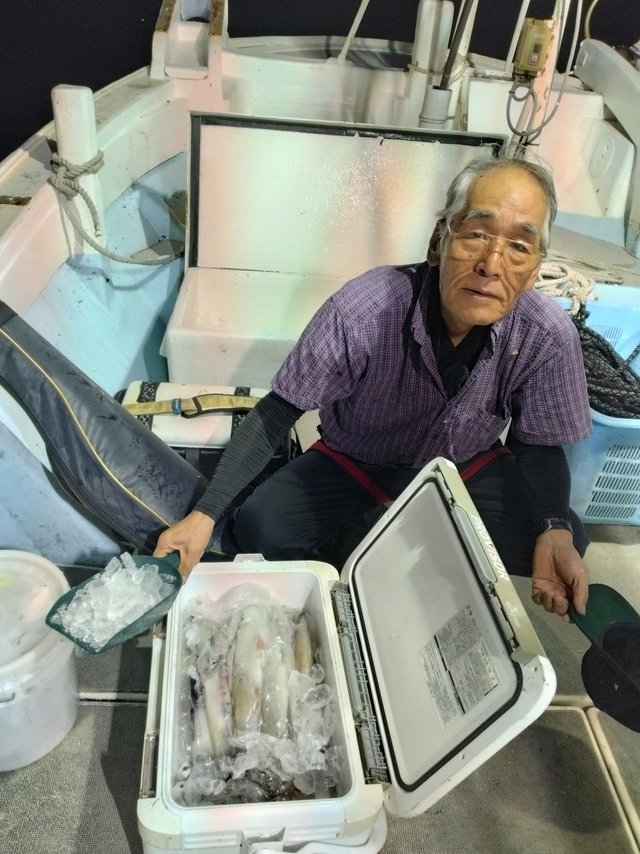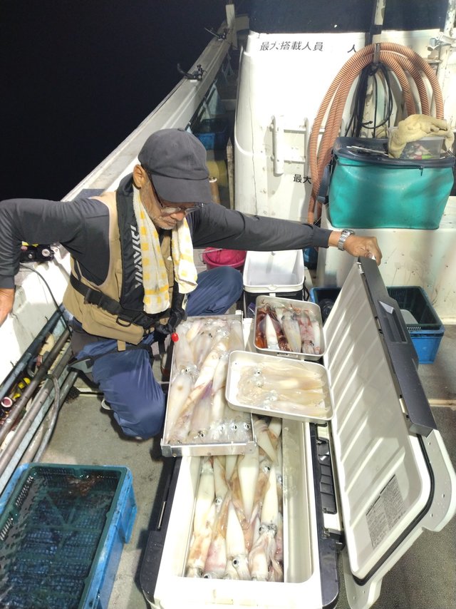 (ケンサキイカ)夜焚きイカ釣りに出港、 今日も海穏やか。 皆さん40パイ位から90パイ位釣れました、 型も良かった。 ありがとうございます。 まだイカ釣れそう見たい 釣りに来てください。