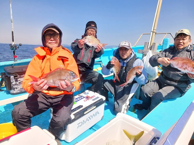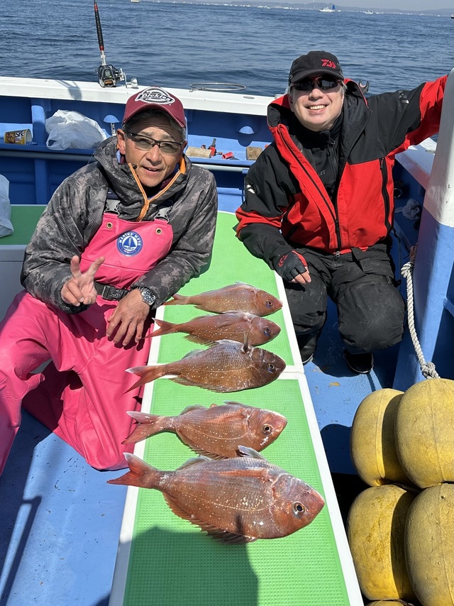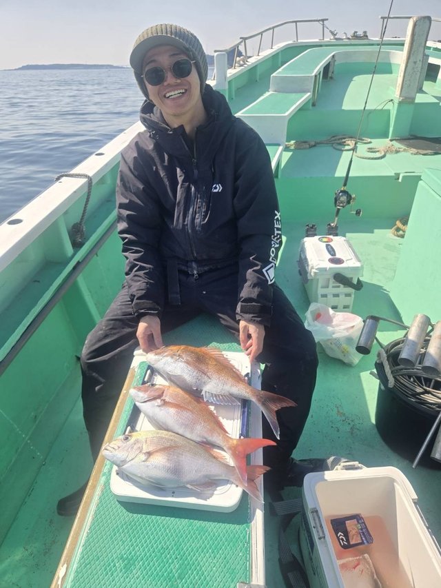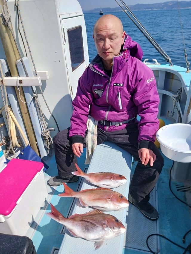 0.50~3.80kg 0~3匹 【マダイ】 500~3800g。3.8㎏相澤さん3.5㎏増田さん3.5㎏木村さん。2枚 木村さん3枚あいざわさん3枚もう一人3枚。 船中20枚 大型活発で自己新記録数名いました~おめでとうございます。 外道ホウボウ。 明日3/22アジ貸切です。 3/23-29アジ釣りです。