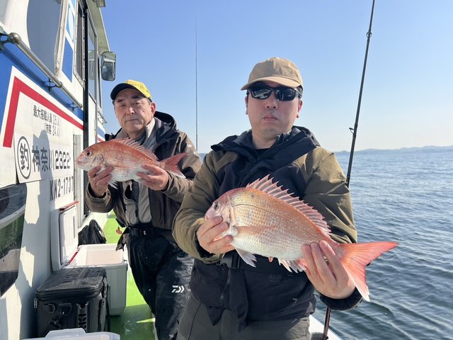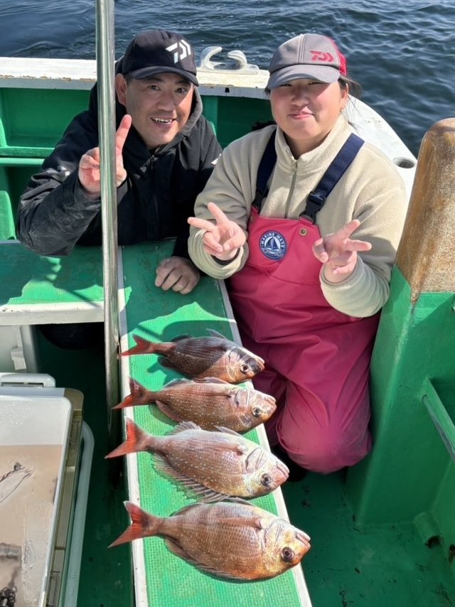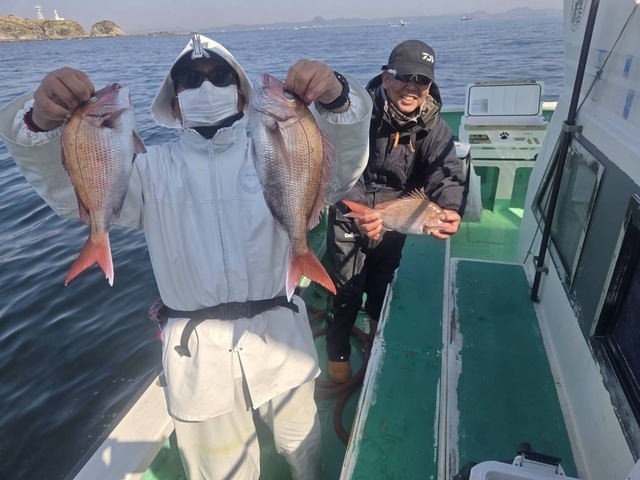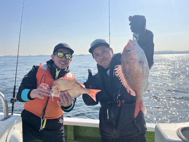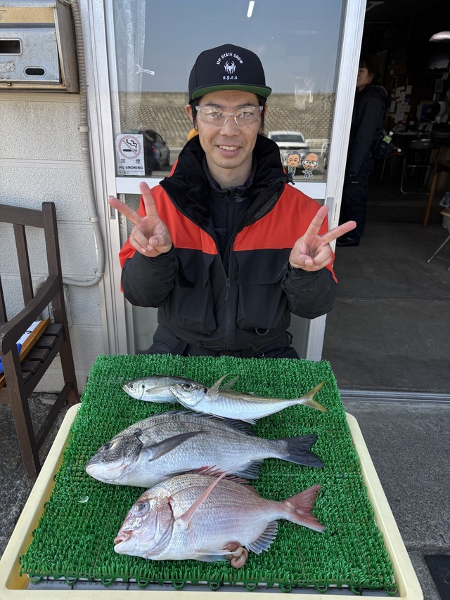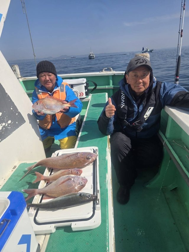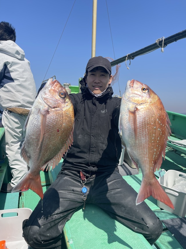 0.80~1.80kg 0~3匹 軽く2隻に分け出船しました。1日を通してポツポツと拾い釣りでした!トップは3枚が2名!ゲストにマアジが交じりました!明日も期待! 明日も1隻でも余裕ですが人数増えれば2隻目も空いてますので是非お出かけ下さい。 今後は人数増えれば2隻体制でお待ちしてます。 オモリは80号 マダイ用ハリス 4~5号8m前後 幅広くご用意下さい。 ※コマセは船の中で割らないようお願いします。(岸壁で割るようお願いします。) ※出船時間の15分前に船を離しますので早めに乗船して下さい。