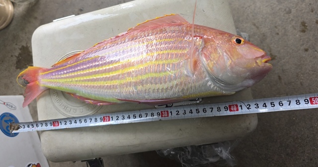 (アカアマダイ)22~49cm 0~3匹 アジ 27~40cm 3~16匹 クロダイ 1.00~1.50kg 0~1匹 ハナダイ 30~33cm 0~1匹 シロアマダイ、カサゴ、ホウボウ、サバ交じる。五目釣りで色々釣れました。
