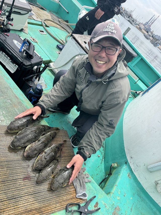 0.40~1.80kg 0~5匹 ショウサイフグ 25~40cm 6~11匹 ◆テンヤマダイ船 サイズ0.4~1.8キロ 0~5枚(オデコ1名) 竿頭箕田さん、中澤さん 外道ハナダイ、カサゴ、ヒラメ、カンダイ、メバル、サワラ、ワラサ、ショウサイフグ ◆ショウサイフグ船 ジャンボフグ主体 サイズ25~40cm6~11匹 午前真鯛船は朝から外道混じりでポツポツ掛かりお土産にはなりました。 フグ船は型は良かったですが潮の流れが悪く数が伸びませんでした。 ご乗船の皆さん、大変お疲れ様でした。ありがとうございました。またのお越しをお待ちしております。 明日は風が強い為中止となりました。