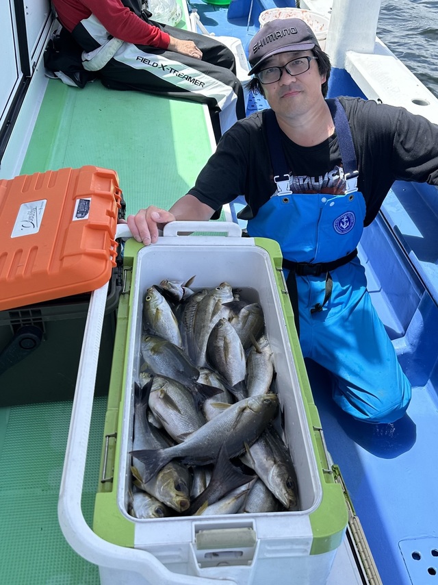 20~35cm 10~43匹 序盤は真っ青な澄んだ潮で喰いも悪く、潮が変ってから喰い良くなり、型も良型揃いで釣ることができトップ43匹で、混じりはアジとタカベでした。毎日暑い日が続いていますので、水分補給をしっかりして熱中症対策をお願い致します。26日も出船確定していますので、予約のお電話お待ちしています。本日もご乗船頂きありがとうございました。