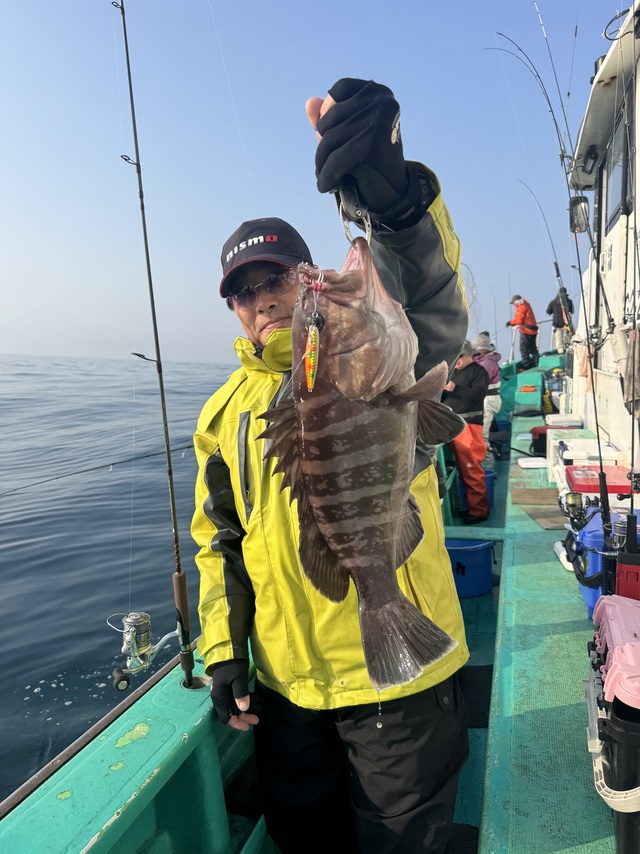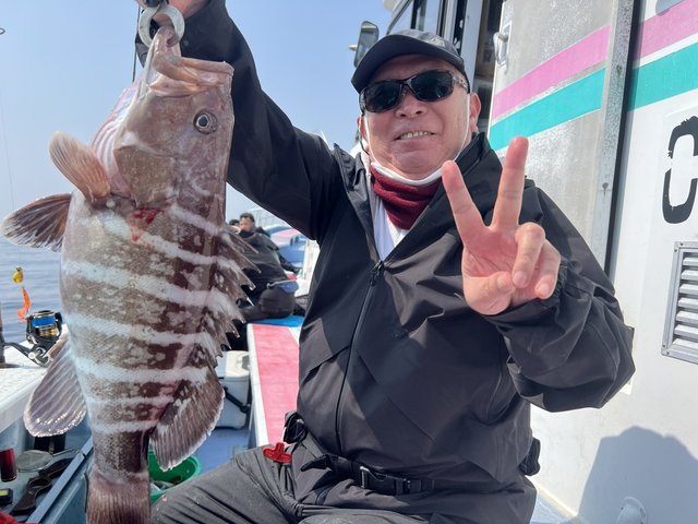 3月はシケが多く出船出来る日が少なかったですね、今日4日ぶりに出船しました。海上ナギでしたが後半風が吹いて来てしまいましたが、最後の流しでマダイ4kgが釣れました。飯田さん新しい竿とリールで釣れたのでニコニコ顔でした。お高い竿のようで値段聞いてビックリ??朝から大型が上がれば良かったのにね。外道ハナダイ、メバル、カサゴ、ハタ、ウマズラ、フグ等多彩に混じりました。竿頭秋本さんマダイ5匹、合わせは上手な方でした。4月も活エビ使用一つテンヤ船で予約受けていますので宜しお願いいたします。海がなぎてくれることを願います。