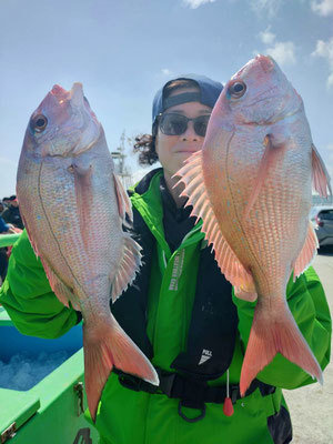 今日のマダイ船、 食わねー食わねーが、食うと、、、 3キロ2キロと型は良かったですが、 今日もありがとうございました。 また宜しくお願いします。