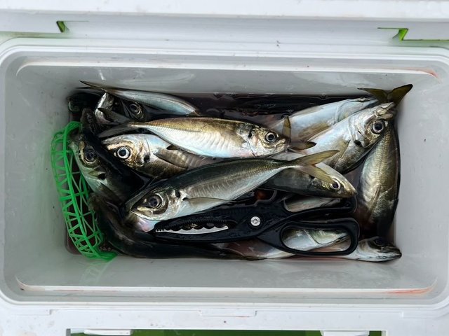 (マアジ)26~37cm 24~102匹 10号アジです。本日はアジ船で出船しました。 朝一は反応動いて顔見ただけでした。 その後ポイント移動していい反応あったので 一日中ポツポツ拾え皆さん平均して30〜40尾 トップは2本竿で102尾でした。 皆さんクーラー満タンでした。 本日もご乗船ありがとうございました