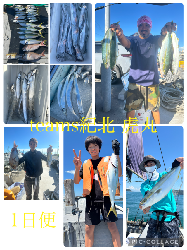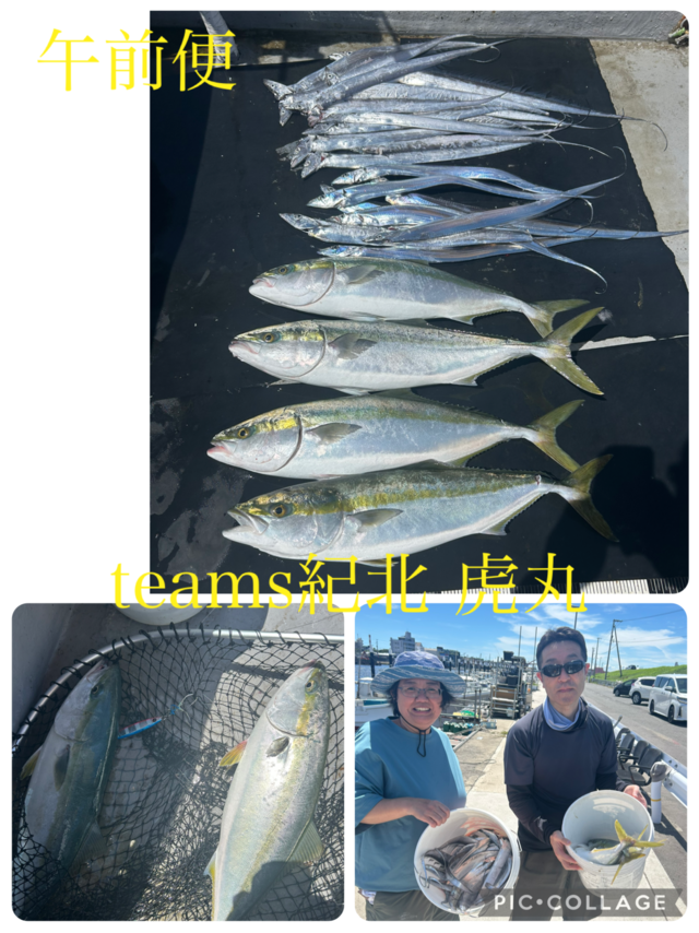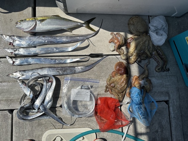 合計59匹 アジ 45~46cm 合計5匹 マダイ 0~1匹 6名でテンヤと銅付き仕掛けでタチウオ釣りとマダイのサビキ釣りで出船。タチウオ釣りではツ抜け4名でその後、サビキ釣りに移動でギガアジのマアジ46cm・45cmなど5匹といいアジが釣れ、最終ポイント移動のひと流しでマダイ37cm1匹釣れました 。