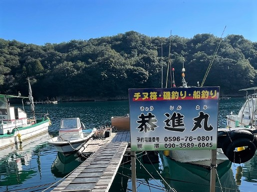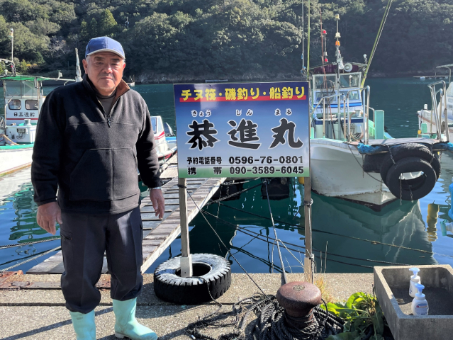 恭進丸は、度会郡の南伊勢町にある方座港から出船します。方座港は、一度訪れたら忘れることができないほど風光明媚な景観とキレイな海が広がります。恭進丸の三浦船長は、釣りのことなら誰にも負けない知識と経験を積み上げたベテラン船長で「釣りは釣れてこそ楽しいんだよね。」とお客様が魚を釣り上げるまで努力を惜しみません。そんな三浦船長は、とても穏やかな性格の持ち主で、話し口調もおっとりしているので沖釣りに慣れない方にも緊張することなく楽しんでいただけます。