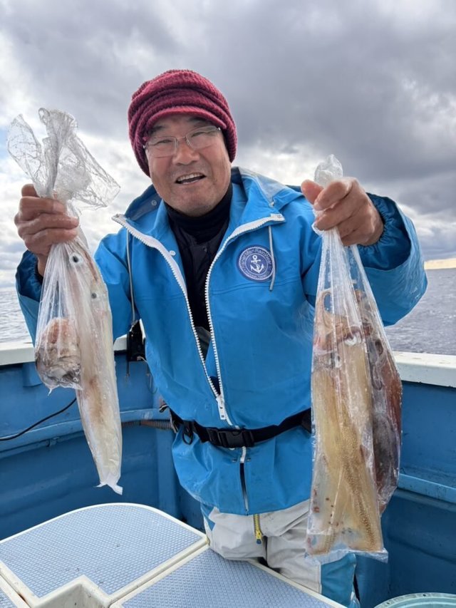 水深140mで、イカはポツリポツリの乗りでたまに3点掛けも見られました。お一人が型見ずでした。今後もヤリイカ船に出船します。
