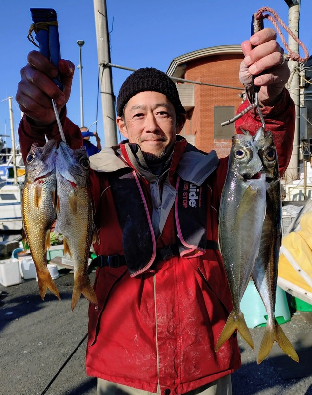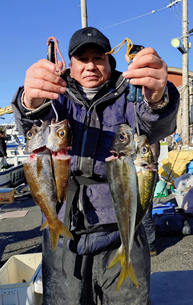 20~38cm 11~36匹 ワラサ 3.60kg 合計1匹 今日31日も朝から文句なしの快晴。 風は北の微風から南の微風へとバトンタッチ、海は一日ベタ凪。これぞ冬のご褒美と言いたくなるような絶好の釣り日和で、気持ち良く出船する事が出来ました。 明日1日もこの好天が続いてくれそうな予報ですので、釣行予定の方は肩の力を抜いて安心してお出掛け下さい。 本日は アジ五目船、根魚五目キンメ・クロムツ船、そしてアジ五目船(アジ好き多め)で出船。 アジ五目船は何時もの浅場からスタート。 反応は相変わらず元気一杯で、ビシでアジ狙いの方は早々に入れ食いモード突入。「もう十分です」と言われても困るくらいの勢いでした(笑)。 一方、落し込みの方はというと、ベイトの付きは今一つで少々静かめ。それでも今日は久しぶりにワラサが顔を見せてくれて、船上は一瞬お祭り騒ぎ。…とは言え、続けて続けてとは行かず、どうやら“顔見せ出演”のみ。ただ、反応自体は確認出来たので、戻って来てくれた気配は十分感じられました。 その後は城ヶ島沖へ移動し、デカアジ&サバ餌でクロムツなども狙いました。 昨日は元気だったクロムツですが、今日は少々お寝坊気味。デカアジは一時一荷で上がる場面もあり、「おっ?」と思わせてくれましたが、これも長続きせず…。どうやら本気は明日以降に取ってある様子で、今日は下見程度だったみたいです。 最後は再び浅場へ戻ると、アジは相変わらずの入れ食い状態。 残念ながらワラサやヒラメでの一打逆転劇は起きませんでしたが、クーラーの中身はしっかり埋まって納竿となりました。 明日からも状況を見ながら、色々狙って行きます。 好天続きの今がチャンスです。是非お出掛け下さい!