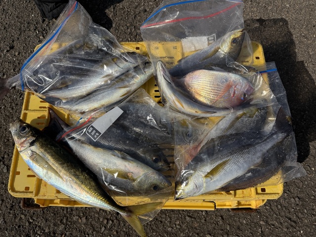 34~39cm 3~12匹 マアジ 40cm 合計1匹 マダイ 30~34cm 合計3匹 メイチダイ 35cm 合計1匹 オキアミ五目釣りに行って来ました。