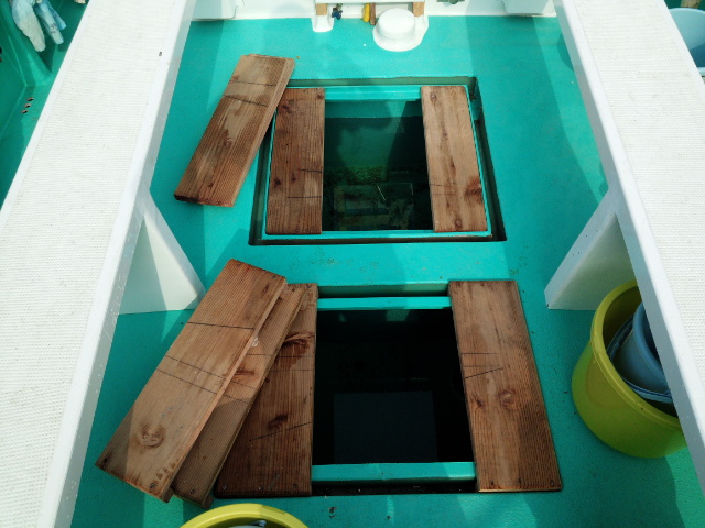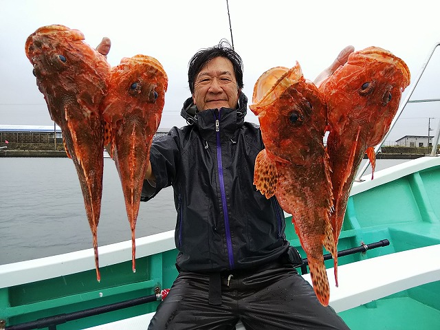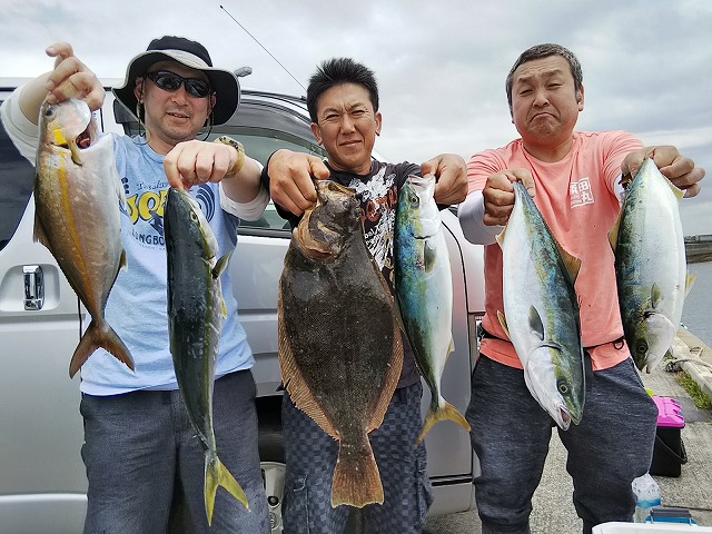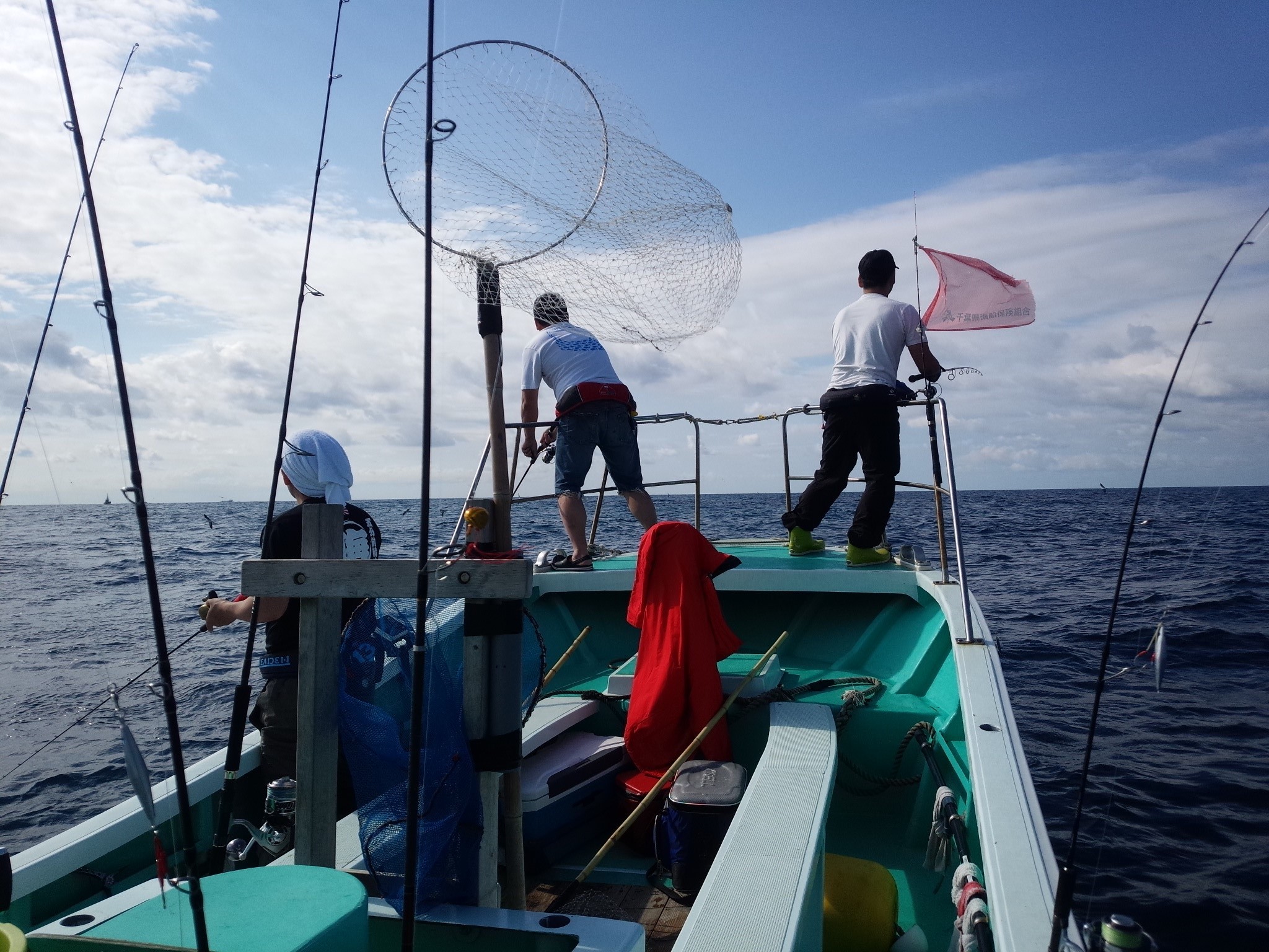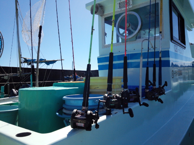 朝一番は港の出口あたり水深15mくらいの浅葉で泳がせの餌用の鯵釣り、サビキであっという間に30匹くらい釣れました。生き餌は十分となり水深50~60mの本命ポイントにgo! 真鯛狙いのコマセ釣りしながら脇でもう一本竿を出して泳がせ釣りも開始、が・・・イサキしか釣れない・・・。いくらコマセ撒いてもイサキとサバ、ウマズラばっか・・・。やっといい当たりが来て良型の真鯛かと思ったけど海面でも暴れていてワラサ・・・。意気消沈してたらアジ泳がせに強い当たりが来た!!。 ドラグ出されながら上げてきたら・・・ハリスたぐっている時にはヒラマサかと思ったけど・・・ダイエット中だったのかスリムな大きめのブリ・・・残念。コマセ釣りの方は竿を振ればサバやイサキばっかりなので棚でビタ止め、なるべくコマセは絞って置き竿で待つこと10分、ついに来た!!~。グイグイと強い引きでドラグから10mくらい糸が出される。慌てずゆっくりとやりとりしながら上げてきたら海中に白っぽい影が! あれ~なんかタイとは違うなあと思いつつ長ハリスをたぐっていくと・・・ゲッ!! 2k超えの立派なシマアジじゃん! 特上の外道に思わずにっこり。納竿間際に今度は泳がせ竿が絞り込まれて4k近いカンパチまで釣れちゃいました。本命はダメでも青物ざんまいで楽しい釣りできました。早川船長ありがとうございました。