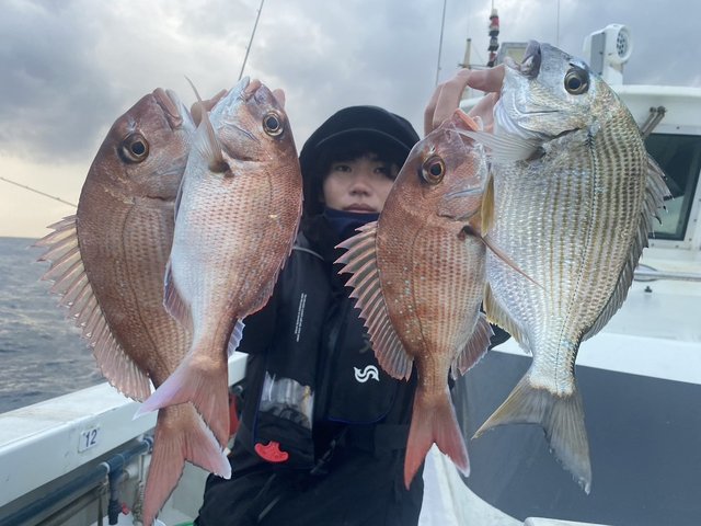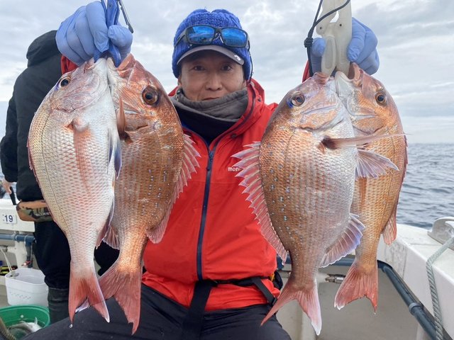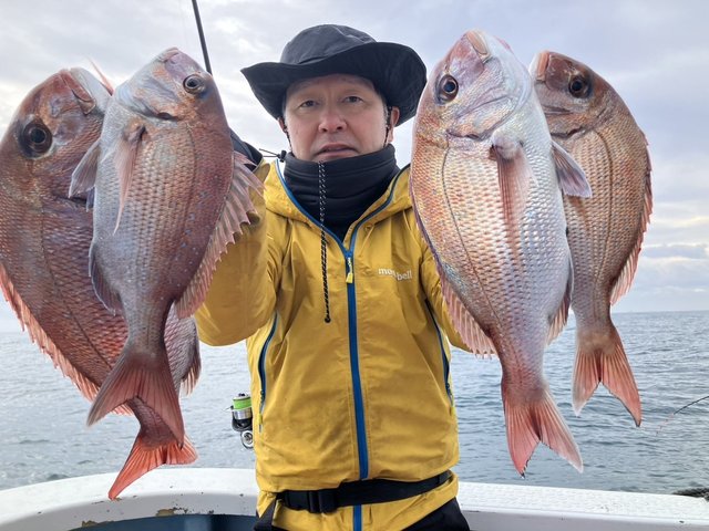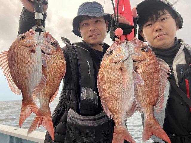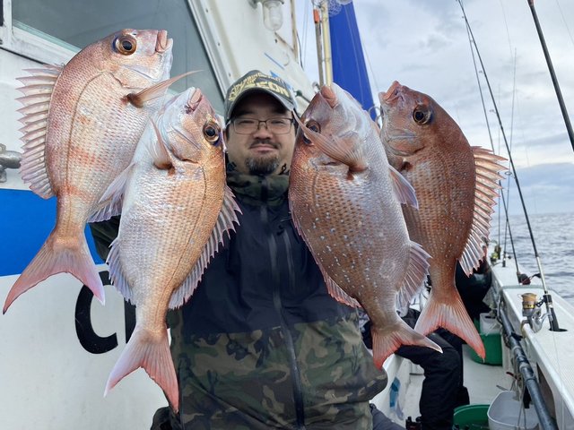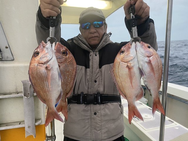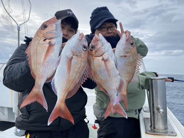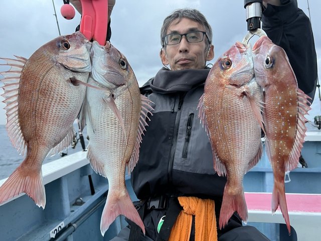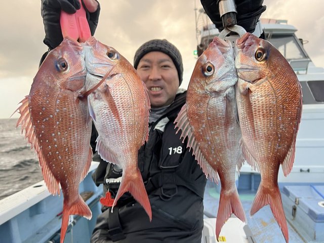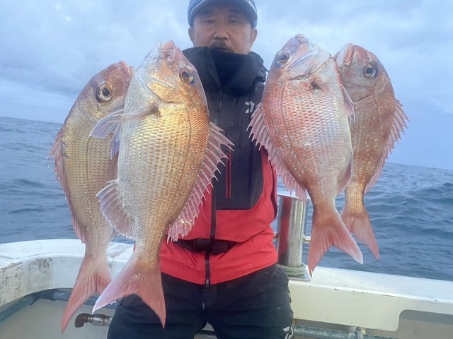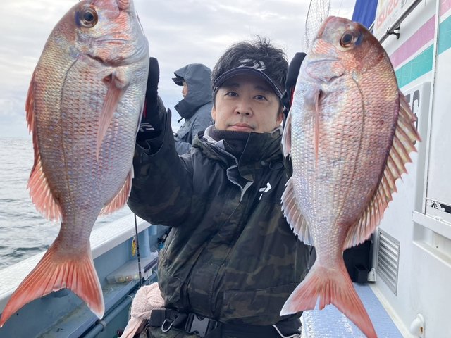 0.30~1.30kg 1~15匹 マダイ 0.30~1.30kg 0~14匹 ★★★活きエビでの一つテンヤマダイ釣り♪★★★ (活き海老エサが準備できない場合は冷凍海老での釣行になります。) エサは、こちらで準備しております。 エサの追加料金は頂いておりません。 <マダイ船1> 一つテンヤでのマダイ釣りです。本日は貸竿・初心者の方の貸切で出船しました。魚影反応多く雰囲気良いが先日の時化の影響が少し残っているのか遠投して広く探らないとアタリが出辛く、初挑戦の方には難しい釣りでした。厳しい条件下だったが皆さん本命確保でき、多彩な外道と併せてお土産になりました!!型も600g前後主体で心地良い引きを楽しめました。魚影反応は広範囲に多くあるので海況良ければ今後も好釣果が期待出来そうです!!! 外道:ハナダイ、イナダ、カサゴ、カワハギ、マハタ、マダコ。 <マダイ船2> 一つテンヤでのマダイ釣りです。1.0kgアップ混じりでサイズ感良く、パターンの合った方は終日コンスタントに釣れて10匹超え。他の方もポツポツと本命や外道が上がりお土産になりました。 外道:ハナダイ、カサゴ、マハタ、ホウボウ、ヒラメ。 ***キャビン内、店内はマスクの持参着用をご協力お願い致します*** <今後の予定>***集合時間まえにはお越しください。 午前船:4時30分船宿集合…マダイ船。 午後船:10時30分船宿集合…マダイ船。 定休日:第2火曜日(1/13) (土、日、祝日は、貸竿のお客様、貸竿の必要なグループ様は5分前集合でお願い致します。) (*状況により予定が変わることもございます。前日に確認のお電話をお願い致します。) <ご予約・お問い合わせはこちらへ> 090-2155-0500(午前9:00~午後8:00まで) キャンセルにより他のお客様へご迷惑をおかけしてしまう事もありますので、キャンセルの無いようご予約をお願い致します。 <乗船名簿について> ①お名前(フルネーム)、②住所、③緊急連絡先の電話番号、④年齢、⑤性別 ①~⑤まで記入し可能であれば、持参お願い致します。
