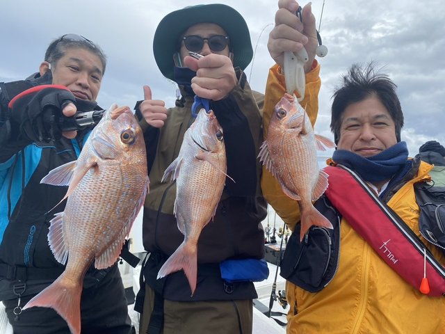 0.30~3.00kg 0~13匹 マダイ 0.30~1.60kg 0~10匹 ★★★活きエビでの一つテンヤマダイ釣り♪★★★ (活き海老エサが準備できない場合は冷凍海老での釣行になります。) エサは、こちらで準備しております。 エサの追加料金は頂いておりません。 <マダイ船1> 一つテンヤでのマダイ釣りです。コンスタントに本命の追加が見られ、10匹オーバーが3名。大鯛3.0kgも姿を見せてくれました♪反応多く、活性上がればバタバタっと釣れそうな雰囲気。次回も期待です! 外道:ハナダイ、カサゴ、ウマヅラ、ヒラメ、オオニベ、イシダイ、キジハタ。 <マダイ船2> 一つテンヤでのマダイ釣りです。潮の流れが悪かった為か真鯛の活性上がらず色々とポイントを変えて見たが、当たらずポツポツ程度でした。次回また頑張ります。 外道:ハナダイ、カサゴ、ヒラメ、ハタ。 ***キャビン内、店内はマスクの持参着用をご協力お願い致します*** <今後の予定>***集合時間まえにはお越しください。 午前船:4時30分船宿集合…マダイ船。 午後船:10時30分船宿集合…マダイ船。 定休日:第2火曜日(1/13) (土、日、祝日は、貸竿のお客様、貸竿の必要なグループ様は5分前集合でお願い致します。) (*状況により予定が変わることもございます。前日に確認のお電話をお願い致します。) <ご予約・お問い合わせはこちらへ> 090-2155-0500(午前9:00~午後8:00まで) キャンセルにより他のお客様へご迷惑をおかけしてしまう事もありますので、キャンセルの無いようご予約をお願い致します。 <乗船名簿について> ①お名前(フルネーム)、②住所、③緊急連絡先の電話番号、④年齢、⑤性別 ①~⑤まで記入し可能であれば、持参お願い致します。