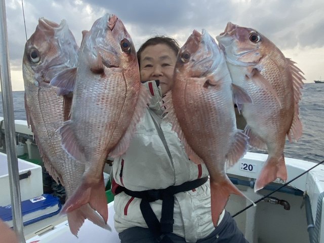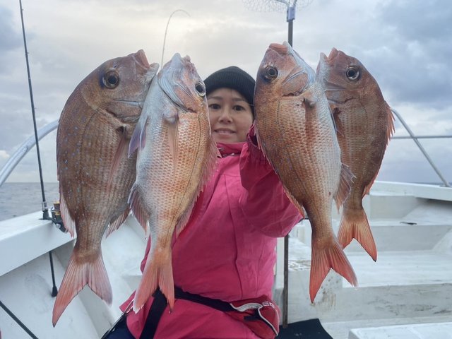 ★★★活きエビでの一つテンヤマダイ釣り♪★★★ (活き海老エサが準備できない場合は冷凍海老での釣行になります。) エサは、こちらで準備しております。 エサの追加料金は頂いておりません。 <午後マダイ船1> 一つテンヤでのマダイ釣りです。TOP19匹、ついで15匹、11匹、10匹と絶好調!800g前後の良型も混じりで上がってくれました。パターン合わず伸び悩む方もいましたが、皆さん本命が釣れてお土産に♪ 外道:ハナダイ、カサゴ、ウマヅラ、オオニベ、ショゴ。 <午後マダイ船2> 一つテンヤでのマダイ釣りです。派手な上がりは無いがコンスタントに型が見られオデコ無く絶好調!入れ食いでも良い、大きな魚影反応があるがウネリを嫌ったのか素直に口を使わずにポツリポツリといった上がりでした。マダイは数多くいそうなのでウネリが取れ、口を使い出せば爆釣が期待出来そうです!!時化後の出船が楽しみです。 外道:ハナダイ、ヒラメ、ウマヅラ、マハタ。 ***キャビン内、店内はマスクの持参着用をご協力お願い致します*** <今後の予定>***集合時間まえにはお越しください。 午前船:4時30分船宿集合…マダイ船。 午後船:10時30分船宿集合…マダイ船。 定休日:第2火曜日(1/13) (土、日、祝日は、貸竿のお客様、貸竿の必要なグループ様は5分前集合でお願い致します。) (*状況により予定が変わることもございます。前日に確認のお電話をお願い致します。) <ご予約・お問い合わせはこちらへ> 090-2155-0500(午前9:00~午後8:00まで) キャンセルにより他のお客様へご迷惑をおかけしてしまう事もありますので、キャンセルの無いようご予約をお願い致します。 <乗船名簿について> ①お名前(フルネーム)、②住所、③緊急連絡先の電話番号、④年齢、⑤性別 ①~⑤まで記入し可能であれば、持参お願い致します。