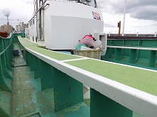 海上は陸地より洋服1枚分寒いと思ってください。風を通さないカッパやウインドブレカーなどがよいでしょう。船のデッキ上は足元が濡れますので、長靴がオススメです。