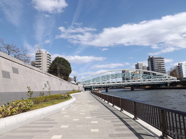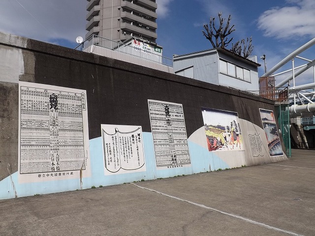 入舟は隅田川、千住大橋の袂(たもと)から出船しています。入り口の公園を抜けると船着場への階段があり、階段を越えると、綺麗な遊歩道と共に、情緒ある隅田川の眺めが広がります。船着場前の壁には葛飾北斎の[富嶽三十六景/武州千住]や、歌川広重の「千住の大はし」が描かれ、江戸の風情をめいっぱい感じる事ができます。その上、隅田川を船で下っての出船となりますので、【江戸】の時代にタイムスリップしたような気持ちになるかもしれませんネ。