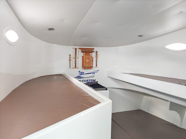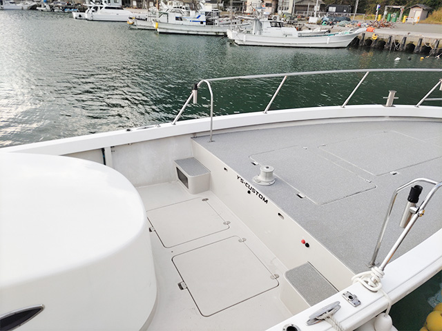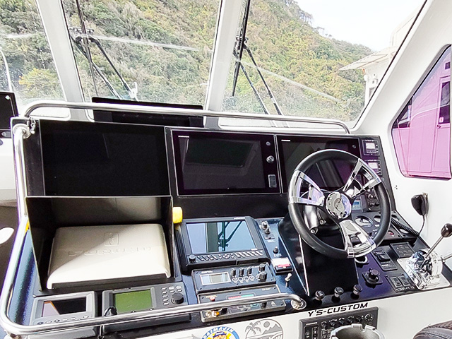 アンチローリングジャイロ(波による船の横揺れを軽減する装置)、Furuno 魚探&GPS、探見丸システム、潮汐モニター、ロッドホルダー、大型クーラー、ブロアー、夜焚き用電球(イカ釣り)、発電機10kg、補機、エアコン