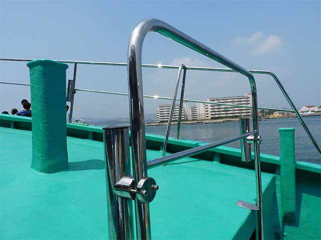 海上は陸地より洋服1枚分寒いと思ってください。風を通さないカッパやウインドブレカーなどがよいでしょう。船のデッキ上は足元が濡れますので、長靴がオススメです。