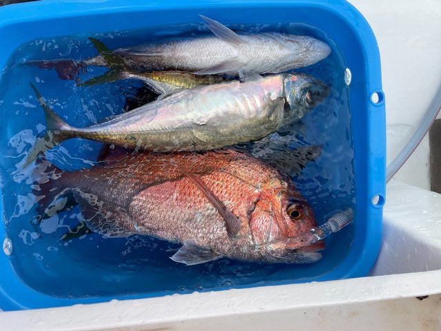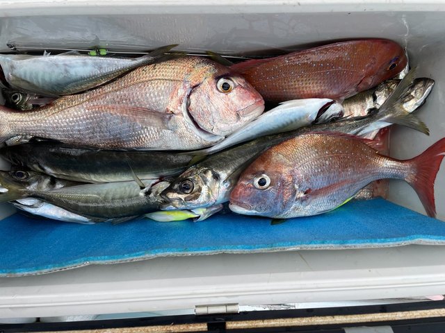 1.20~2.20kg 合計6匹 アジ マダイ/1.2㎏~2.2㎏/6匹、 ギガアジ/24匹、 アジ/30匹。 潮トロトロといい感じだったからか、 先にアジが食ってしまい 今日はマダイが少なかったです。