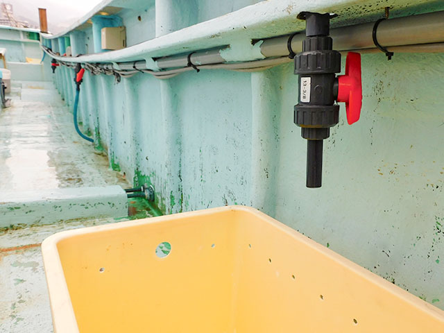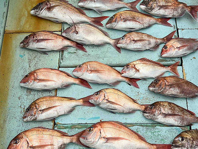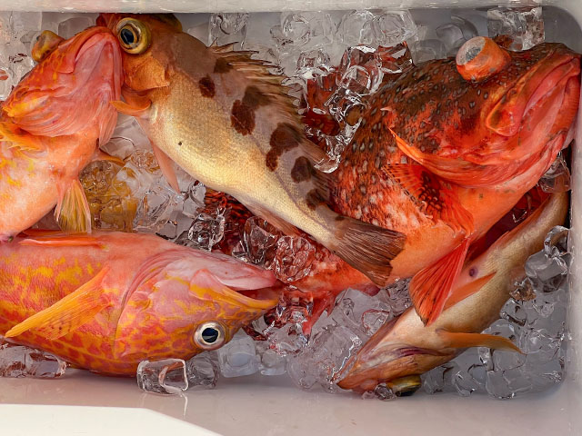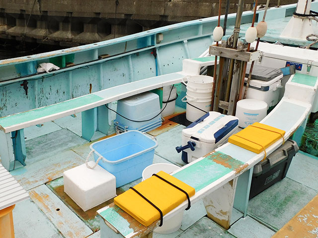 午前船の場合、おおよそ11時半が納竿の目安です。頃合いを見て船長より納竿のアナウンスをします。残った餌の処理や釣った魚の鮮度を保つための対処をご案内します。氷は港に到着するまでの暫定冷却と考えてください。港で新たに十分な氷を補充します。
