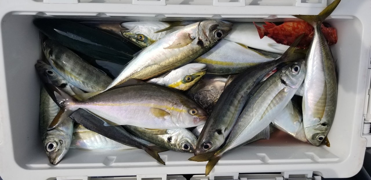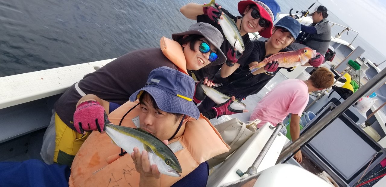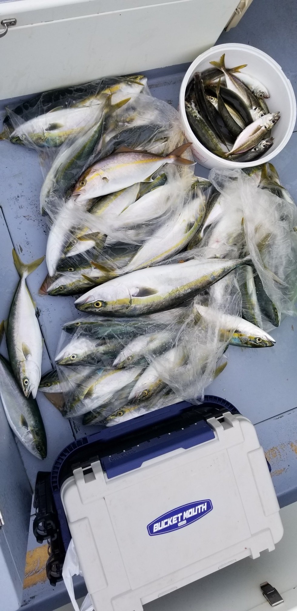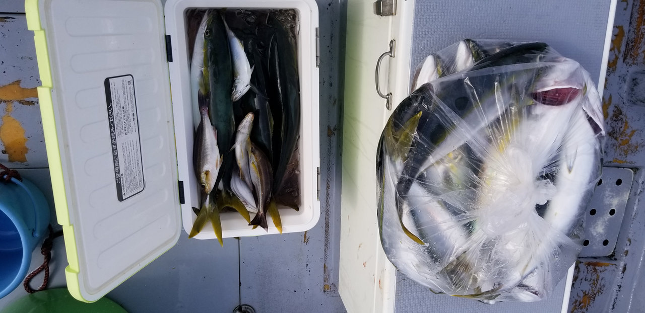 20~34cm 0~7匹 イナダ 47~55cm 3~13匹 アジ 16~21cm 6~20匹 ヒラソーダ 0~3匹 キントキ カサゴ 今日もご乗船有り難う御座いました。 コアジが連れながらハナダイ交じり後イナダ釣りポイント着きアジ泳がせ仕掛けで遊んだ方に良型カンパチらしき強い引きやり取りしましたが10号ハリス切られちゃい、、残念 天秤仕掛けの方はイナダ良い感じで!多数バラシや4号5号ハリス切れもあり (皆さん疲れちゃったらしく休み休み) イナダ沢山居るので沢山釣りたい方なら幾らでも 落とし込み仕掛けの方にも、泳がせ仕掛けにもイナダでしたが釣れてました。 他ヒラソーダ時折 釣果ハナダイ20〜34cm0〜7枚・イナダ47〜55cm3〜13本・アジ16〜21cm6〜20匹・ヒラソーダ0〜3本・キントキ・カサゴ