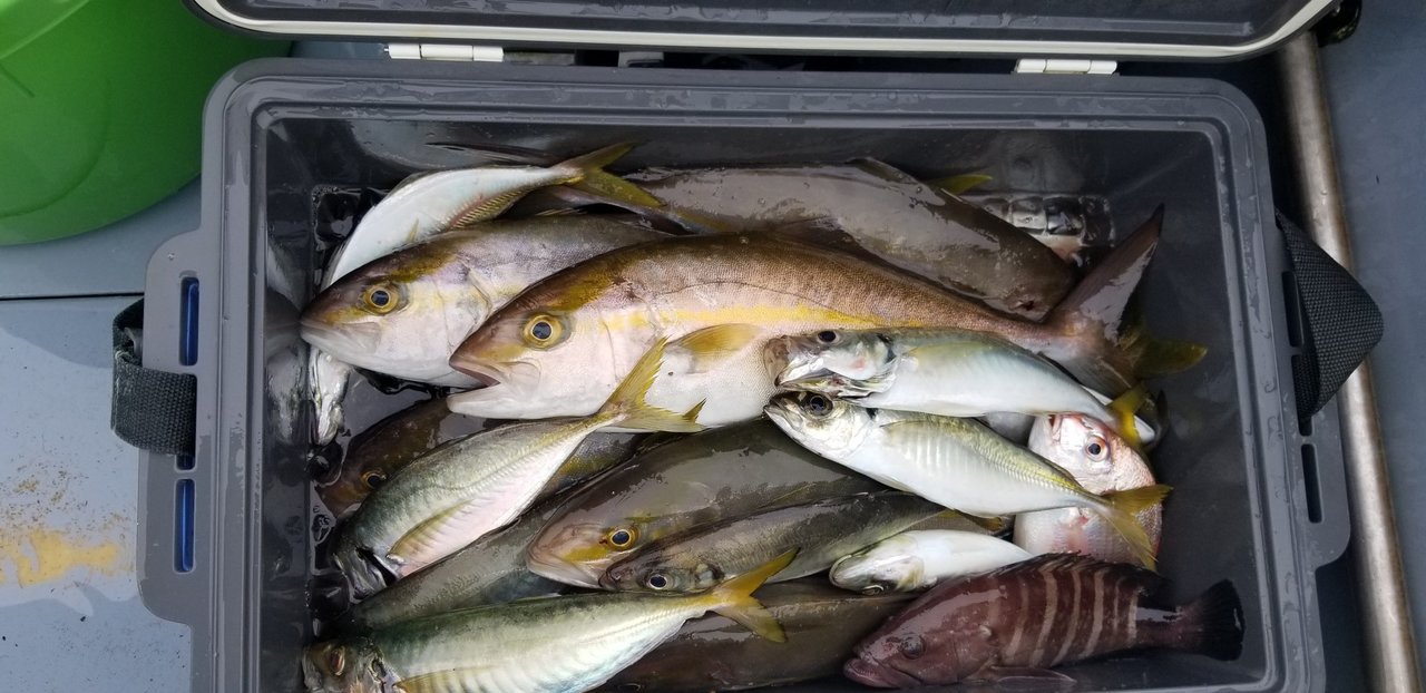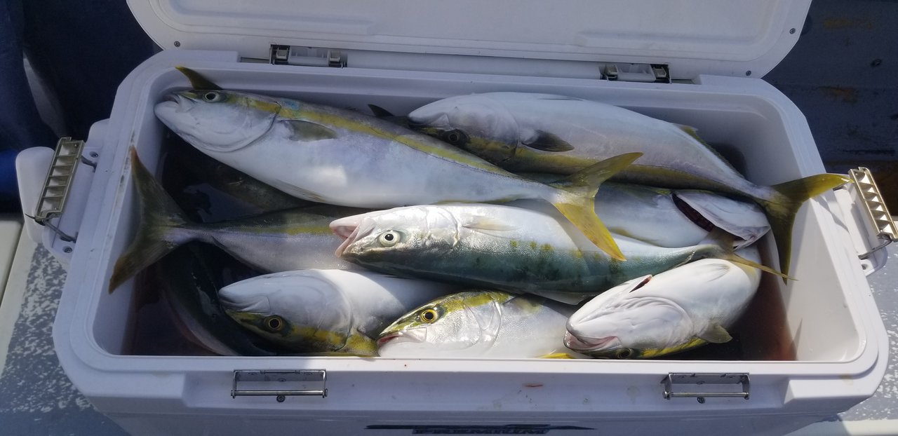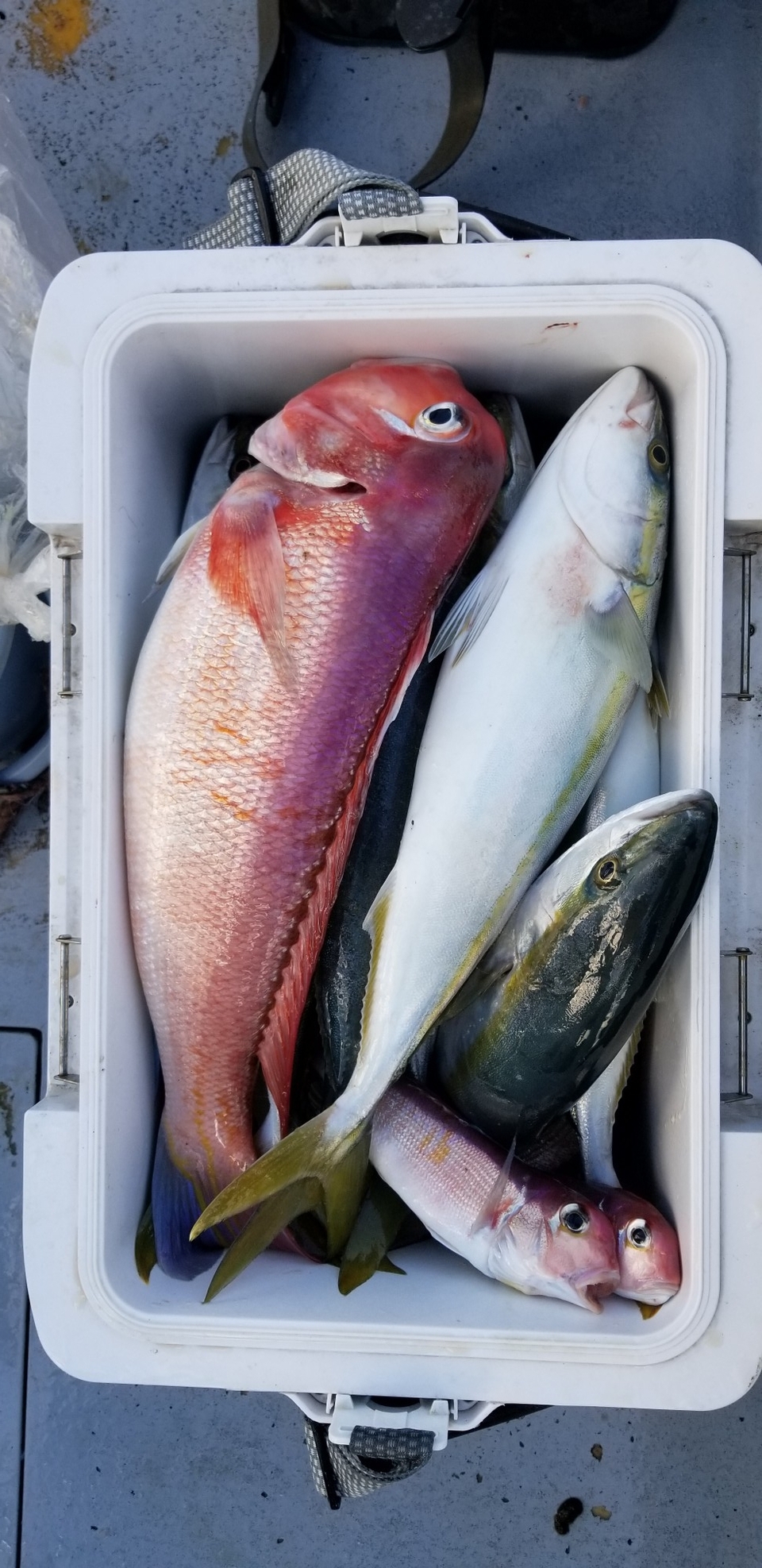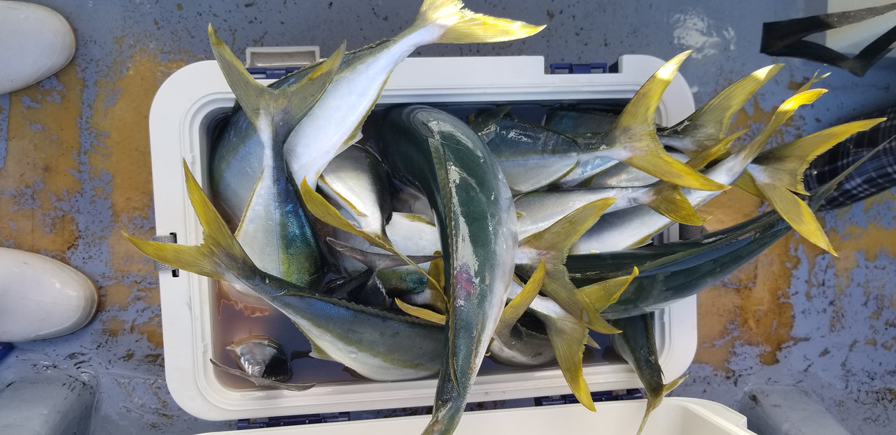20~34cm 0~7匹 イナダ 47~55cm 3~13匹 アジ 16~21cm 6~20匹 ヒラソーダ 0~3匹 キントキ カサゴ 今日もご乗船有り難う御座いました。 コアジが連れながらハナダイ交じり後イナダ釣りポイント着きアジ泳がせ仕掛けで遊んだ方に良型カンパチらしき強い引きやり取りしましたが10号ハリス切られちゃい、、残念 天秤仕掛けの方はイナダ良い感じで!多数バラシや4号5号ハリス切れもあり (皆さん疲れちゃったらしく休み休み) イナダ沢山居るので沢山釣りたい方なら幾らでも 落とし込み仕掛けの方にも、泳がせ仕掛けにもイナダでしたが釣れてました。 他ヒラソーダ時折 釣果ハナダイ20〜34cm0〜7枚・イナダ47〜55cm3〜13本・アジ16〜21cm6〜20匹・ヒラソーダ0〜3本・キントキ・カサゴ