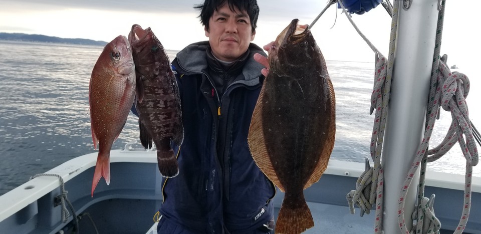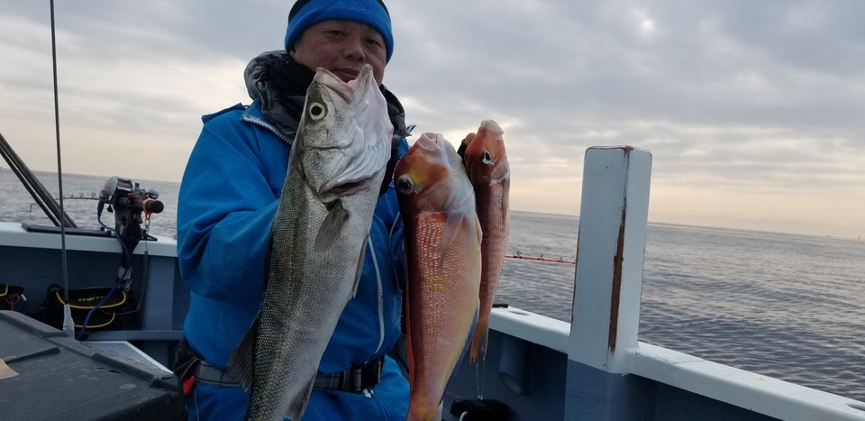 クロダイ ハナダイ カワハギ カサゴ シロアマダイ マハタ ホウボウ イトヨリ トラギス ウマヅラ ソーダガツオ ご乗船有り難う御座いました。 昼まで北風強く移動し難い 小アジクロダイシマシマハナダイカワハギカサゴ後イナダ釣りに行くメニューですが、風強すぎてイナダポイント棄権シロアマダイ狙い浅場水深40m流しとりあえずシロアマダイ確保他マハタホウボウイトヨリカサゴダルマカレイトラギス後今が旬のイナダを釣りに皆さん強い引きで喜んで頂き47〜55cm4〜9本(4号ハリス切れどころか6号ハリス切れもワラサも交じってるとの事)アジ泳がせて遊んでも宜しいと! 交じりにウマズラソーダガツオ12時20分時間となり港へ 明日も明後日凪予報出船します。 毎日空いてます。 予約受付中です。