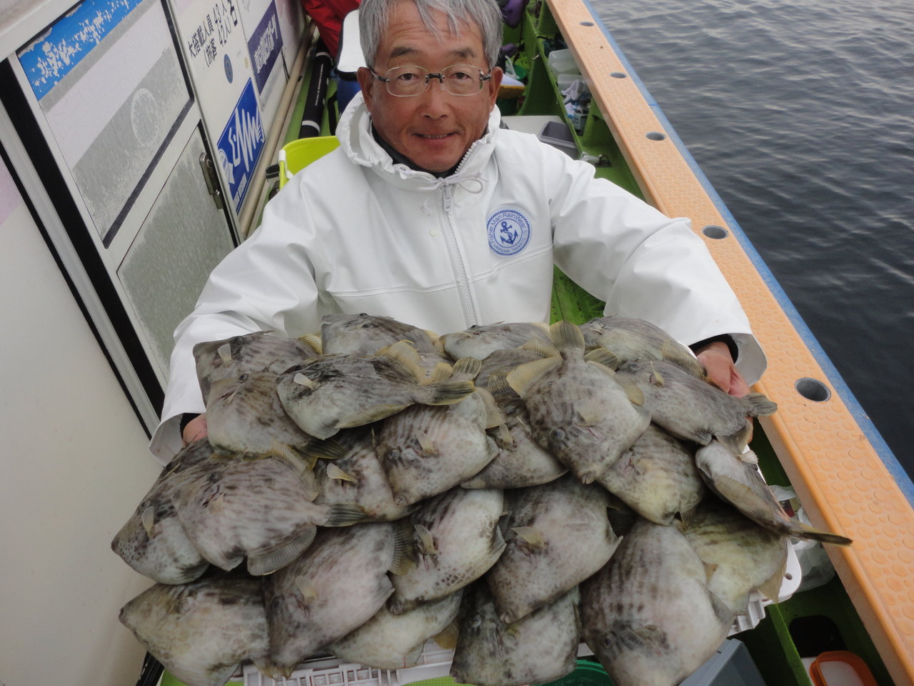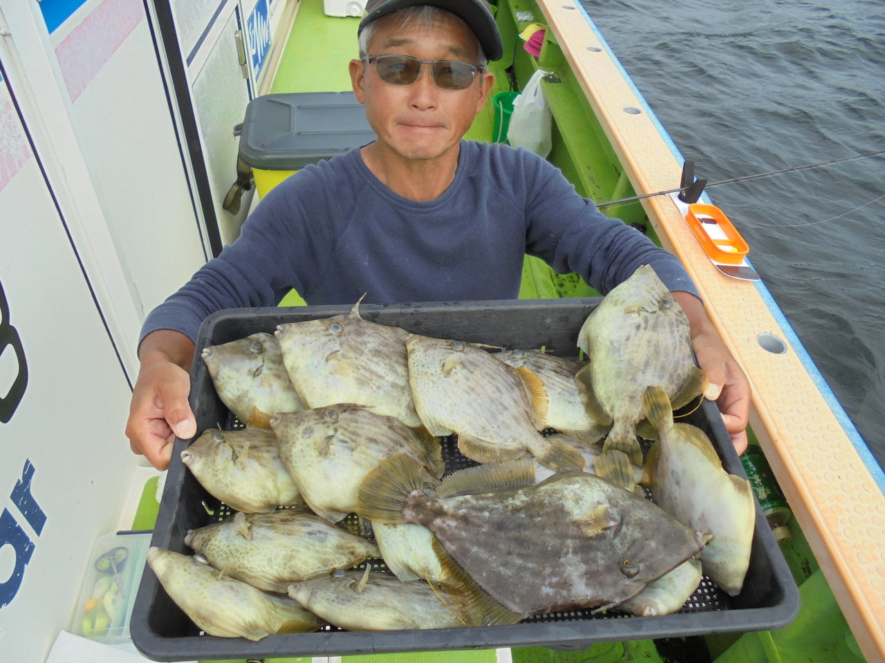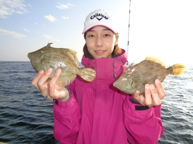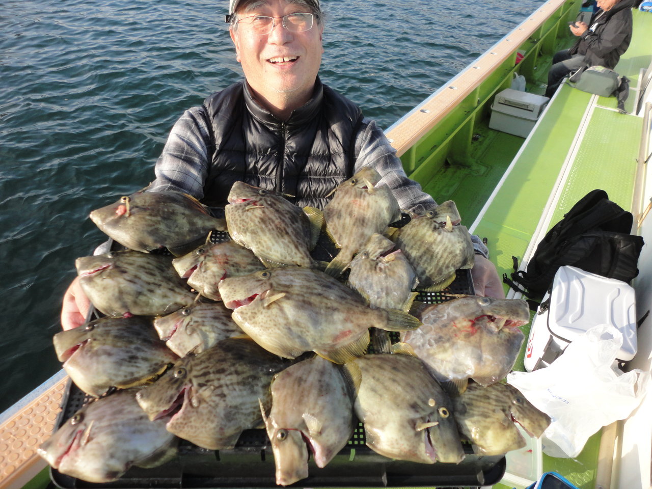 16~28cm 3~27匹 乗合2隻で鴨居沖30m前後の深場ポイントを中心にやって行きました。 海上はウネリが残ってましたが、昨日の極寒を思うと暖かで、風も穏やかな良い陽気でした。 水温は14℃位の低水温でしたが、カワハギのアタリは昨日と同じ感じで前半の上潮、後半の下潮共に潮に流れながら船中ポツポツ釣れてました。 多少のウネリがあったので、巻き上げが上手く出来てない方はバラシが多くありました。 今日はダブルの場面が殆ど見られなかったですが、連チャンは度々ありました。 潮止まりの時間帯がテクニカルなので、このタイミングにアタリを出せると釣果アップに繋がると思います。 ウネリと低水温の悪条件でしたが皆さん健闘して貰えて、良型混りで今日も好釣果に持って行けました。 トップは名手.佐藤さんが難しい小さなアタリも上手くキャッチして27枚の好釣果、次いで山崎さん18枚、萩原さん17枚…と続きました