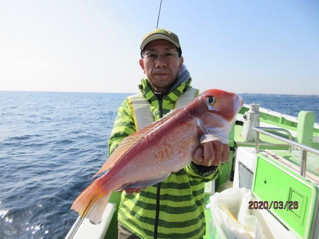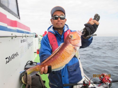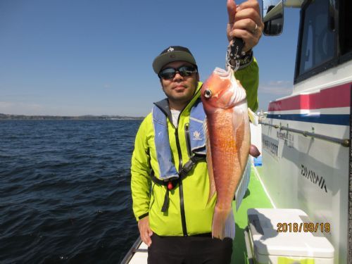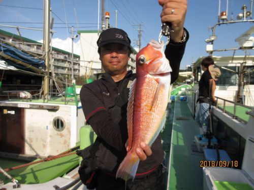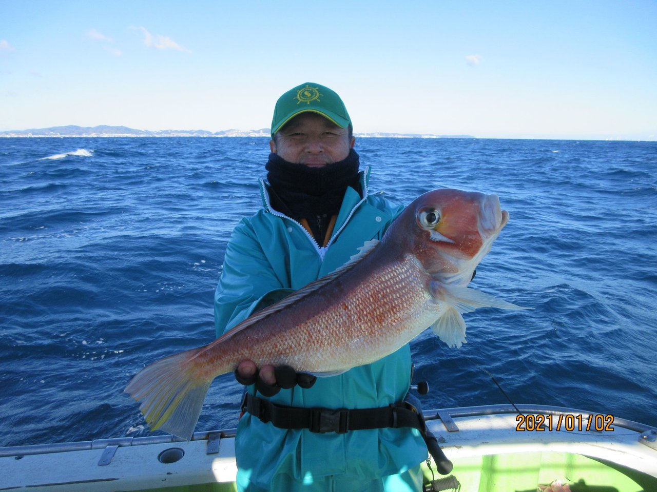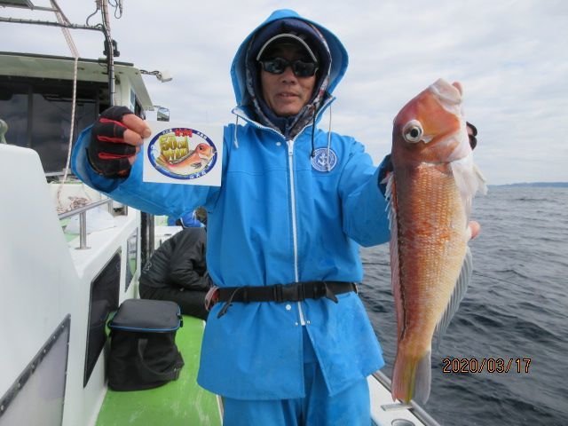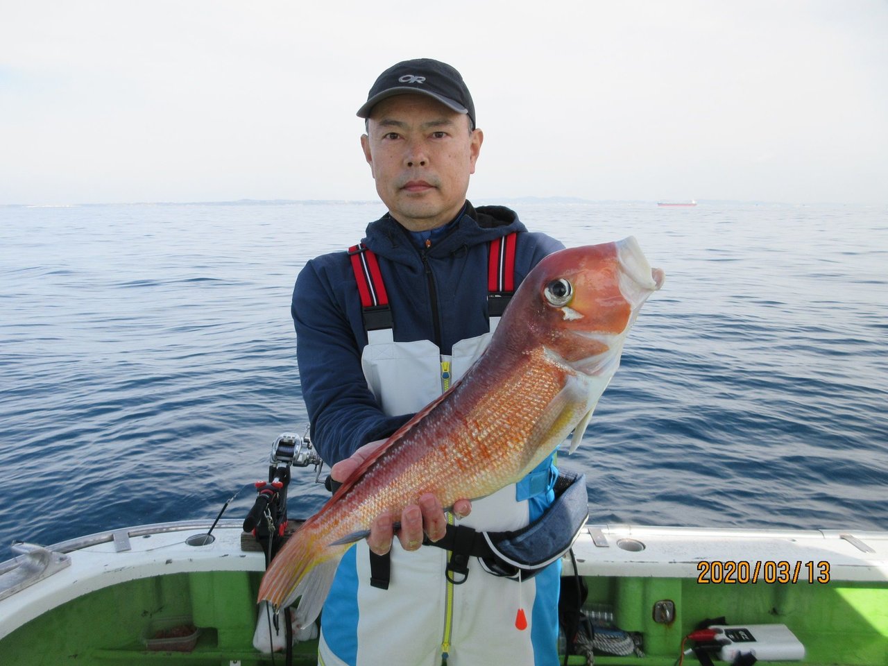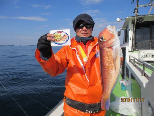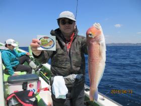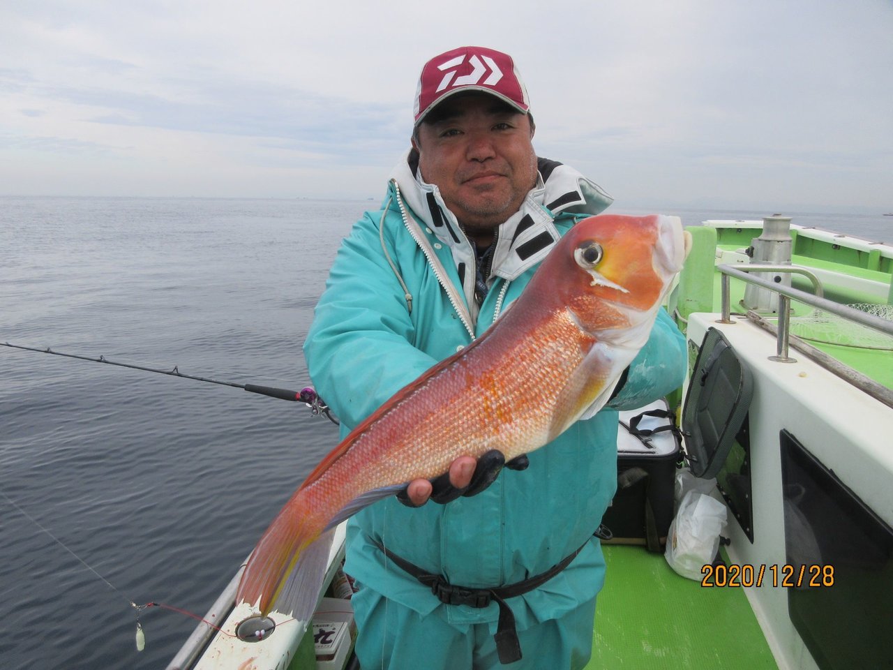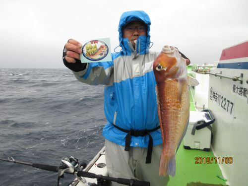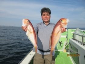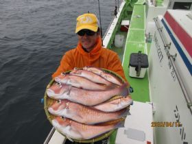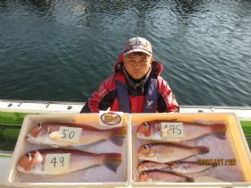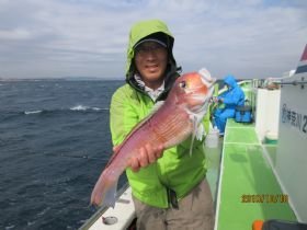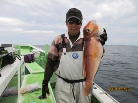アマダイ船。保田沖から金谷沖を転々と狙い、風弱く海上穏やかで良い天気でした。 1日を通してあまり潮が流れず外道のアタリ少なく、各ポイントで本命は船中ポツリと顔見れるものの単発で、サイズは中型主体に良型&大型44cm混じりで終日ポツリポツリの拾い釣りでした。 トップは中・良型揃いに大型44cm含み5尾、2番手4尾、オデコ無く全員ゲット出来ました!