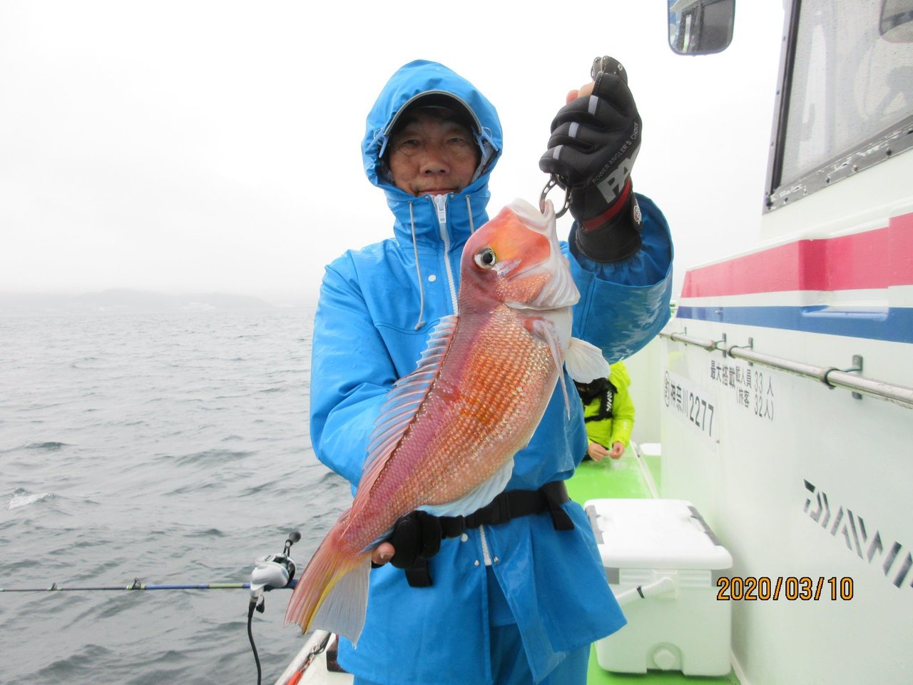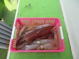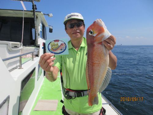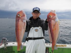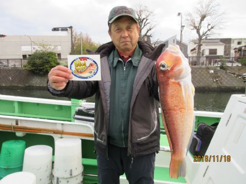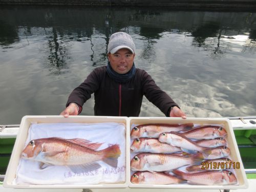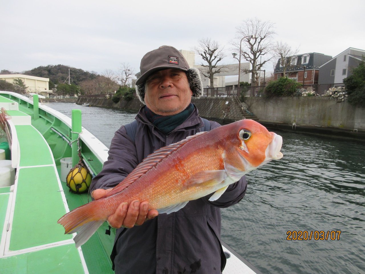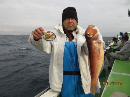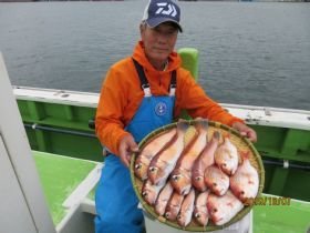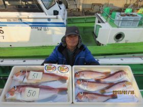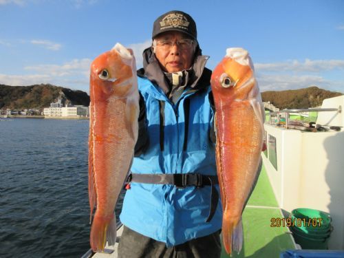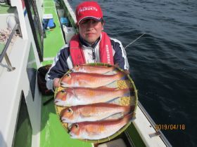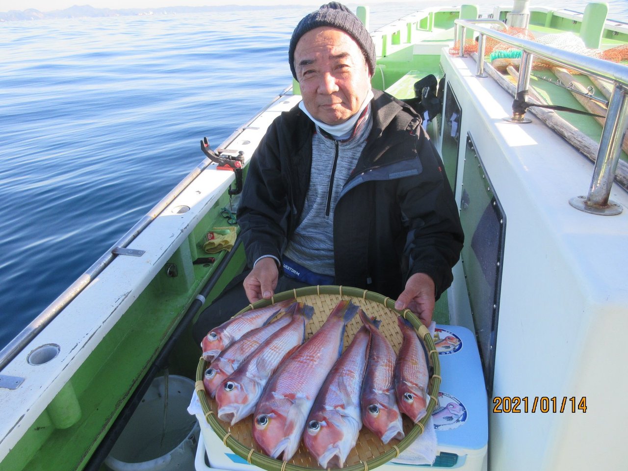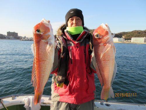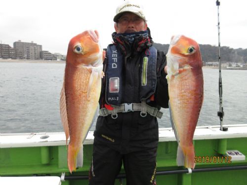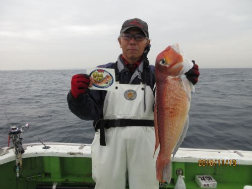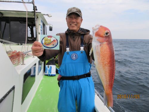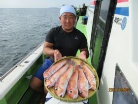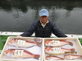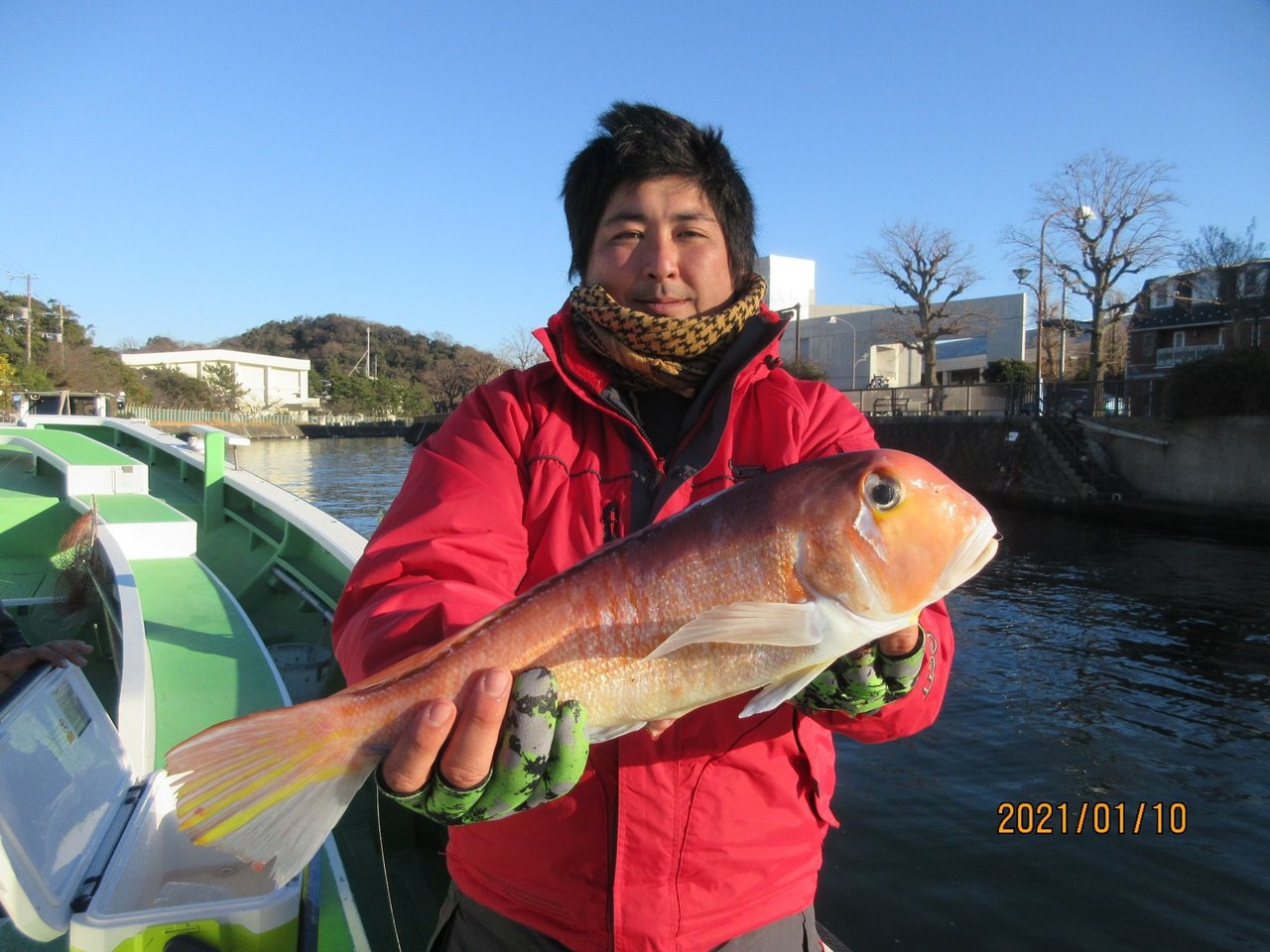 アマダイ船。保田沖から金谷沖を転々と狙い、風弱く海上穏やかで良い天気でした。 1日を通してあまり潮が流れず外道のアタリ少なく、各ポイントで本命は船中ポツリと顔見れるものの単発で、サイズは中型主体に良型&大型44cm混じりで終日ポツリポツリの拾い釣りでした。 トップは中・良型揃いに大型44cm含み5尾、2番手4尾、オデコ無く全員ゲット出来ました!