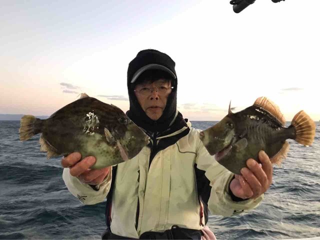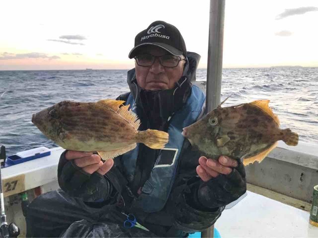『カワハギ午後便。 本日は、波風が有り、釣り辛い状況の中頑張って頂きました。 釣果は、良い人でカワハギ20匹以上でした。』