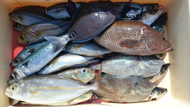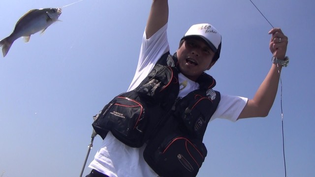 仕掛けをゆっくりと落とすとイサキの群れにあたりました!!(水深16m付近)