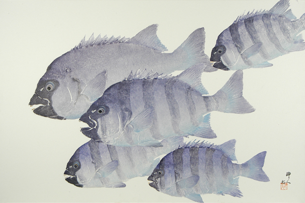 記録として残す場合は1匹しか拓さないが、アートとして拓すときは何匹もの魚を並べたり重ねたり、あるいは背景に草や海草をあしらったりすることが多いのだ。