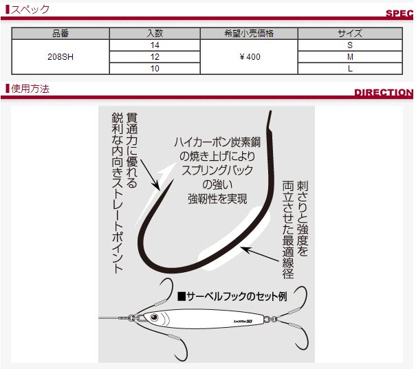 タチウオジギングに拘った「サーベルフック」。このフックはアユ掛鈎の流用ではなく、ハイカーボン炭素鋼から焼き上げたフックで鋭利な鈎先と耐久性、強靭性が特徴。