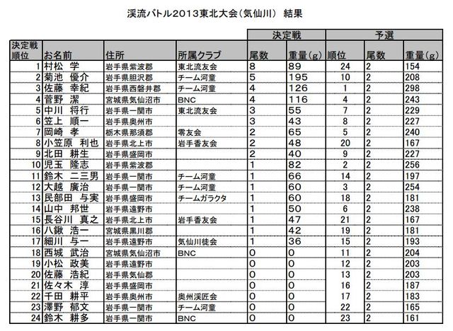 渓流バトル2013東北大会(気仙川)大会結果を公開しました
