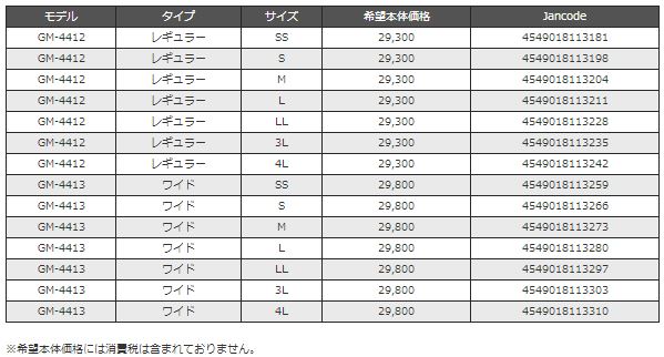 ●GM4412はレギュラータイプ、GM4413は足幅の広いワイドタイプです。 ※リペアソールは専用のものをお使い下さい。