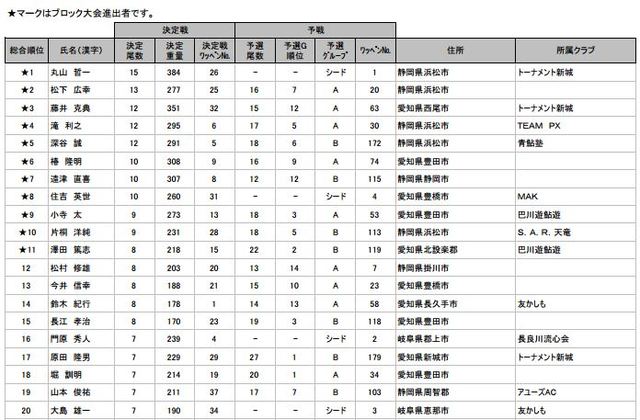 釣況: 前評判では、砂ムシの発生により場所ムラがあると云われていた。午前7時、気温18度、水温18度と低い状況のなか予選がスタートした。最上流、最下流ポイントでは竿がよく曲がり、A組トップは、20尾、B組トップは、27尾とボーダーラインA組13尾、B組11尾と予想を覆した釣果が出た。決定戦は、気温、水温も好転せず小雨の降る中、予選通過30名にシード選手5名を加えた35名で熱戦が繰り広げられた。トップは、15尾、ボーダーラインは、8尾。11名の選手が中部ブロック大会への出場権を獲得した。