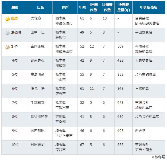 審査方法 予選-総匹数、決勝-総匹数。同匹数の場合は総重量にて決定。上位6名が全国大会出場