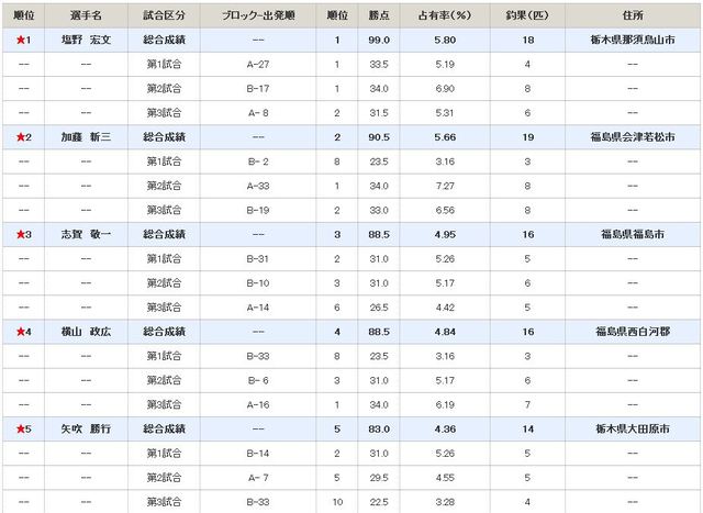 第3試合、Aブロックの1位は新潟大会1位の福島県西白河郡の横山 政広選手。7匹で単独34ポイント獲得です。