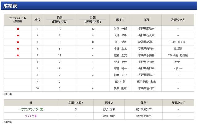 結果的には1回戦2回戦ともに2ケタ釣果を記録された矢沢一郎選手が見事優勝。