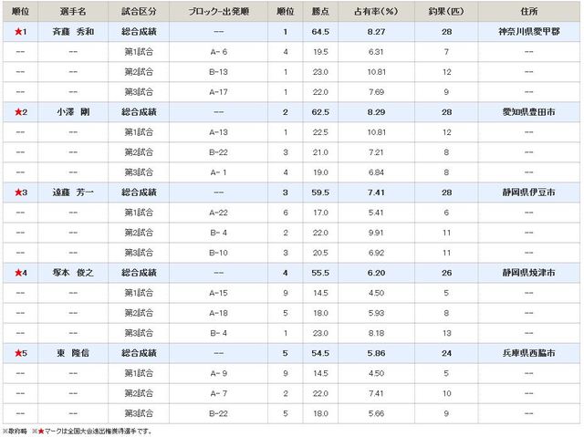 さて注目の総合順位、第2第3試合で連続トップの斉藤 秀和選手が見事総合1位、続いて昨年1位の小澤 剛選手が順当に総合2位。そして、常に好位置をキープされた静岡県伊豆市の遠藤 芳一選手が総合3位、以下、4位・塚本 俊之選手、5位・兵庫県西脇市の東 隆信選手の計5選手がめでたく全国進出となりました。