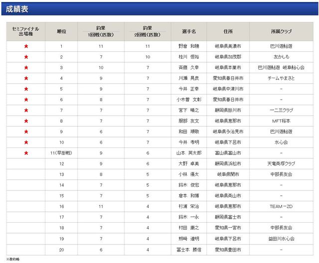 鮎の姿は見えるものの、全体的に追い気の少ない厳しい状況下での競技となりましたが、 その一方、大石のポイントで入れ掛かる選手もおられ、全体的にはトロ瀬、ザラ瀬メインで丁寧に 止め泳がせで釣る選手が数を稼ぐ結果となりました。