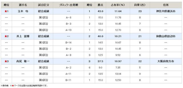 第3試合、Aブロックの1位は第1試合に続いて玉木選手が8匹で単独1位。玉木選手は第2試合も同数3選手ながら2位を記録しており、トータルで43ポイントの圧勝。見事な成績での総合優勝となりました。
