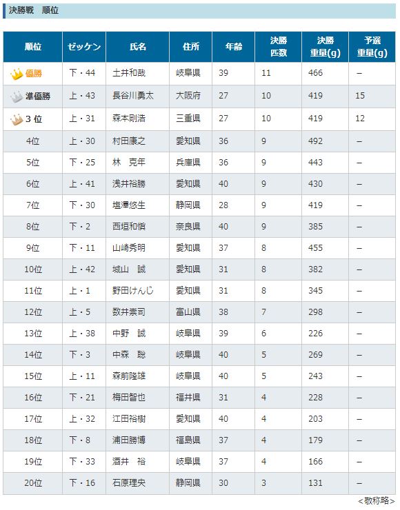 約2時間の戦いを制したのは、唯一オトリ込み11匹の釣果だった地元岐阜県の土井和哉選手。2位と3位はオトリ込み10匹で2名の選手が並び総重量の勝負になりましたが、重量も全く同じという稀に見る大接戦となり、予選の釣果で上回った大阪府の長谷川勇太選手が準優勝、三重県の森本剛浩選手が惜しくも3位となりました。1位~11位の選手が4匹の差の中にひしめき合うという接戦で、1匹の差が大きく勝負を左右する結果となりました。
