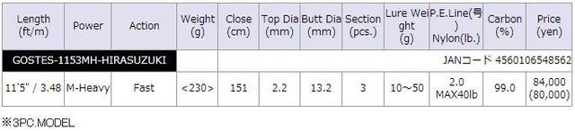 磯でのヒラスズキ専用に開発された全身4軸と6軸組布にて武装された筋肉質ブランクスは、扱いやすい11.5ftという全長であり、かつ2ピースでもなく3ピースでもない、グリップ脱着式の変則3ピース構造の採用によりバランスよく仕上がっている。 向かい風の中を切り裂くようにルアーをロングキャストでき、全身4軸とバットにG-MAPS製法を取り入れることで、ヒットしたヒラスズキに主導権を渡すことなく、ランディング可能な圧倒的なパワーを持つ最強ロッドです。