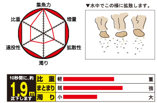 本命を強力に寄せて食わせるための配合エサ。マルキユー独自の"ハイパワードリップ"と"新MP酵母"を配合しているほか、視覚効果の高い赤と緑のタブレットやムギ、コーン、カキガラなど荒い粒子も配合。ブレンド性に優れ、磯から波止、渚までと幅広いフィールドで使えます。