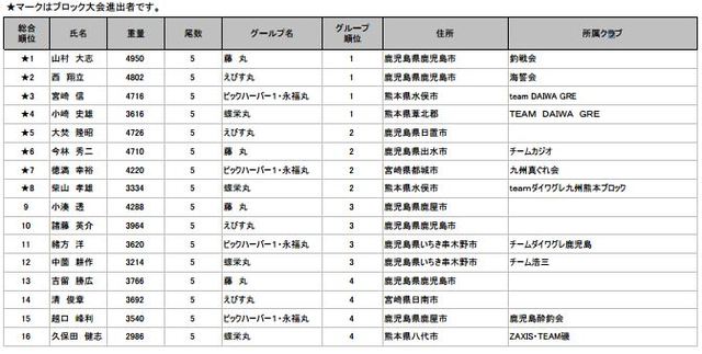 釣況: 前日の荒天がウソのように収まった当日。晴天、ナギのなかで大会は、行われた。ほかの会場と同様、ここも水温が高く、そのためポイントムラが大きく、場所によってはイスズミに悩まされたりもあったが釣れるポイントでは、5匹5kg近い釣果を出すところもあった。この会場からは、ブロックに8名が進出した。水温は、まだ24度あるがもう少し下がると甑や南薩方面も本格的なグレシーズンに突入するだろう。