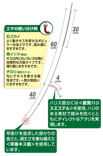 硬質ハリスエステルがダイレクトなアタリを実現する、使い易さを追求し「釣れる機能を凝縮した」ベーシックな投げキス仕掛が登場!!